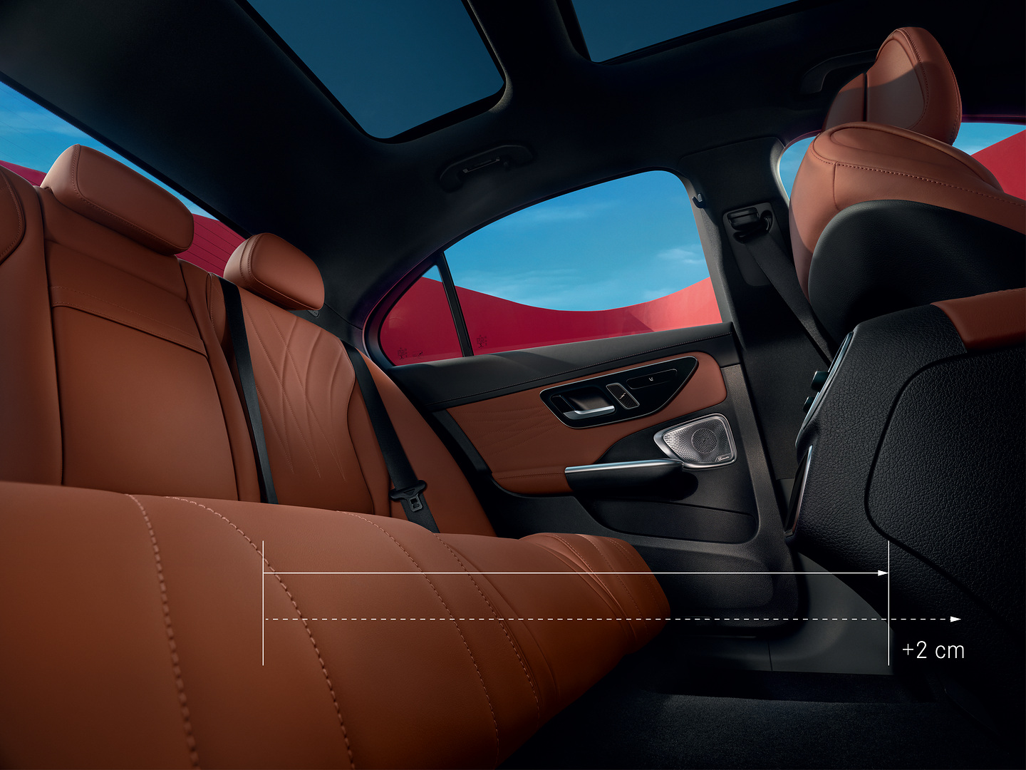 Disfruta de una mayor libertad en la espaciosa parte trasera. El generoso nuevo diseño del espacio trasero de la Clase C ofrece aun más espacio para las piernas de los ocupantes de la parte trasera del vehículo.
