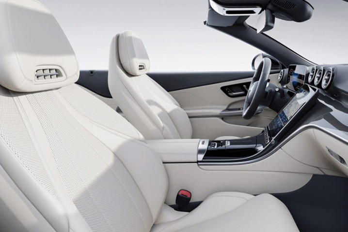 El lujo moderno, ya conocido de la Clase C y el GLC, recibe un toque especialmente deportivo en el CLE Cabrio. Esto se aprecia, entre otras cosas, en el deportivo y exclusivo diseño integral de los asientos deportivos con reposacabezas integrado son visual y funcionalmente impresionantes. Los pronunciados lados del reposacabezas de las banquetas y respaldos de los asientos proporcionan una sensación de primera clase incluso al conducir de manera deportiva.