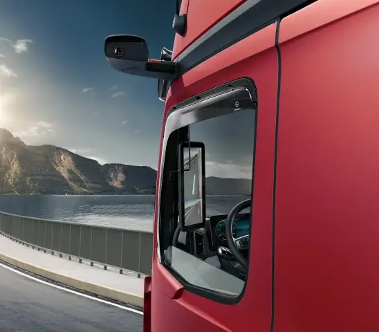 En lugar de los espejos convencionales, el nuevo Actros viene equipado con la innovadora y aerodinámica cámara sustitutiva del retrovisor exterior. De ese modo se ahorra combustible y mejora la visibilidad hacia detrás.