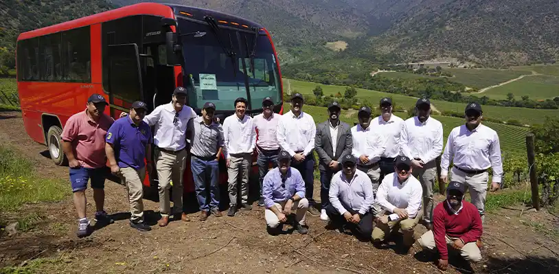 Durante la jornada, representantes de empresas como Rentagro, Transportes Polosur Limitada y Sociedad de Inversiones OROCUP Limitada tuvieron la oportunidad de explorar de cerca el nuevo Optimuss de Mercedes-Benz, un vehículo diseñado para afrontar las exigentes demandas de la industria minera. La agenda comenzó con un recorrido por el viñedo a bordo del bus, disfrutando del paisaje mientras conocían sus características y capacidades. En un ambiente distendido, los asistentes también disfrutaron aprendiendo sobre distintas cepas de vino, lo que añadió un toque especial al encuentro.