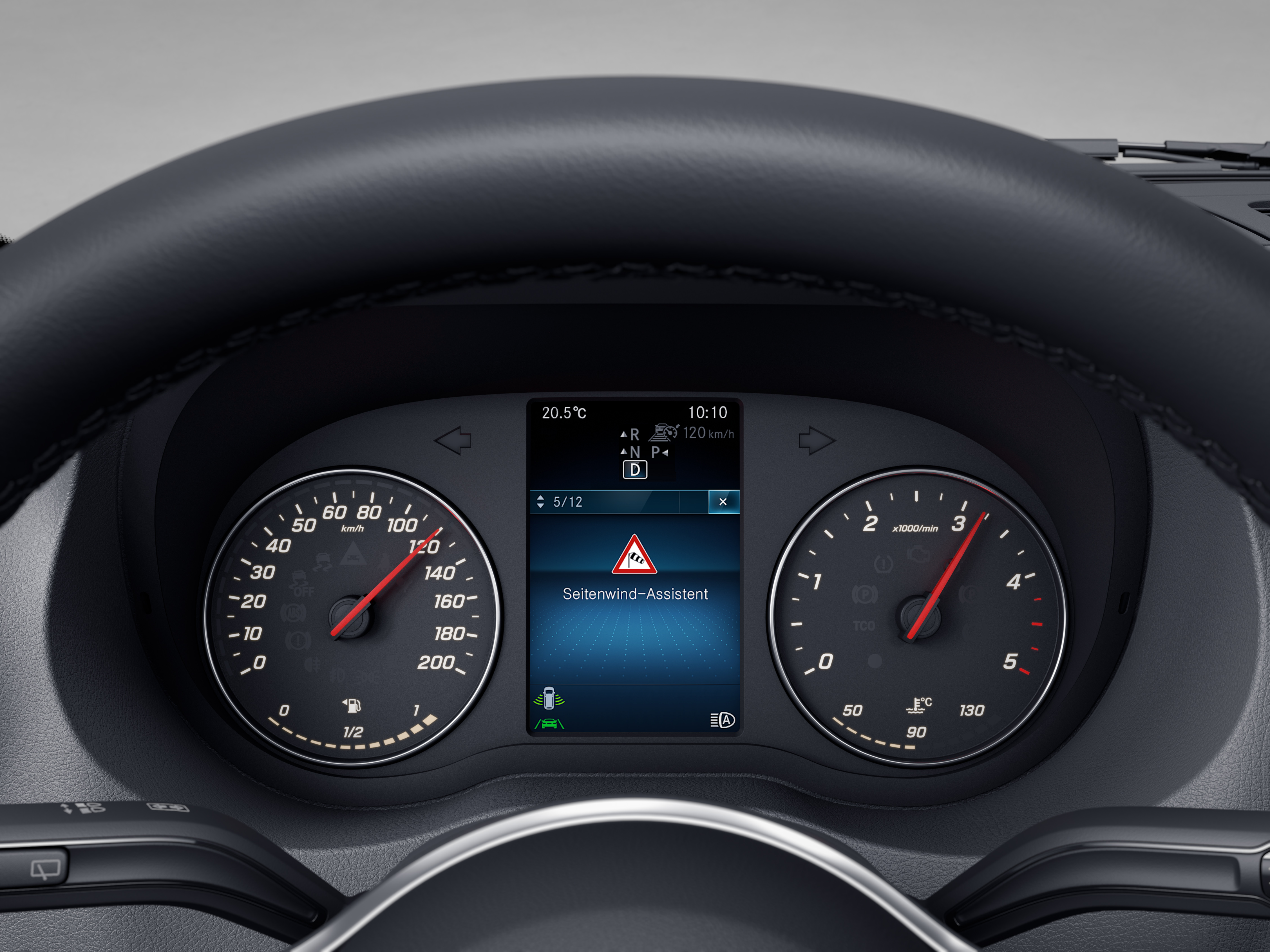 El asistente de viento cruzado se activa automáticamente a partir de una velocidad de 80 km gracias a los sensores del programa electrónico de estabilidad ESP® de serie. De esa forma, un sensor detecta las fuerzas que actúan sobre el vehículo cuando se producen vientos cruzados o ráfagas repentinas y aplica una acción de frenado a las ruedas individuales del lado que mira al viento, logrando contrarrestar el efecto, y reduciendo la desviación de la vía significativamente.